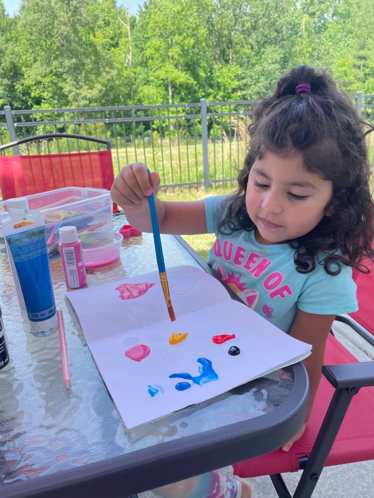 Some white papers, paint, and paint brushes will be enough. Ask questions – What do these colors make you feel? Which line you made is the thickest or thinest? Which line is the happiest….My sweet and happy-go-lucky little girl has a big imagination!