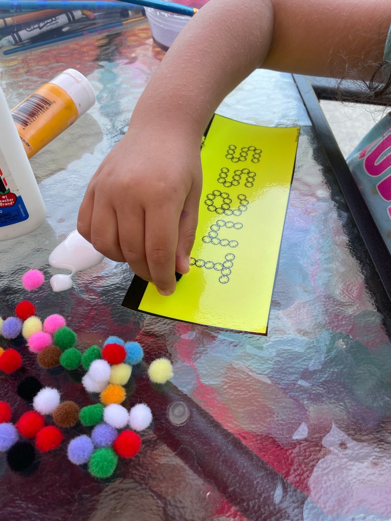Write or print you kid’s name on a piece of paper. Put out an assortment of small Pom poms, and glue.