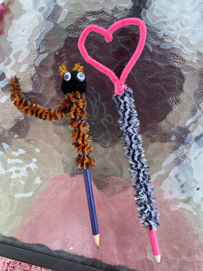 Using the longest piece of chenille stems, twist it around your pencil. Remove spiral from pencil. Pick out a pom pom and glue to the top of the chenille stem spiral. Now you get to decorate your little pencil topper.