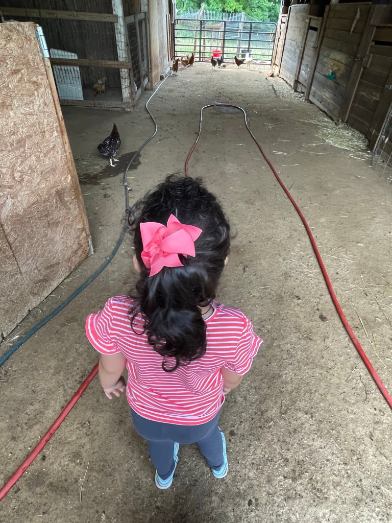 Today, my kids had a wonderful time at the farm . They loved hanging around their friends the chickens, sheep, a donkey, and a farm dog.