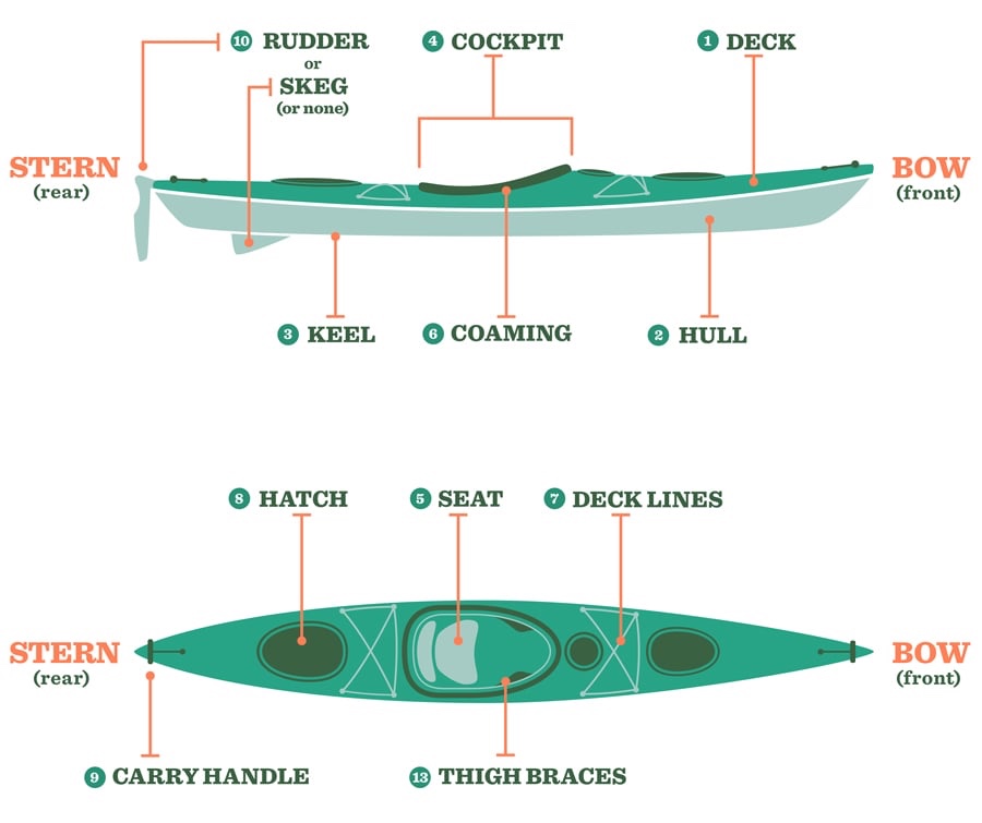 The top of the Kayak is referred to as a deck, and the bottom is the hill. The front is called the bow, and the back end is the stern. The cockpit is the opening in the deck where you sit, and the coaming is the lip of the cockpit where the spray deck attaches to the kayak.