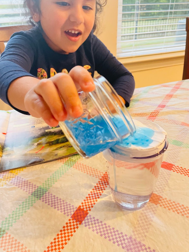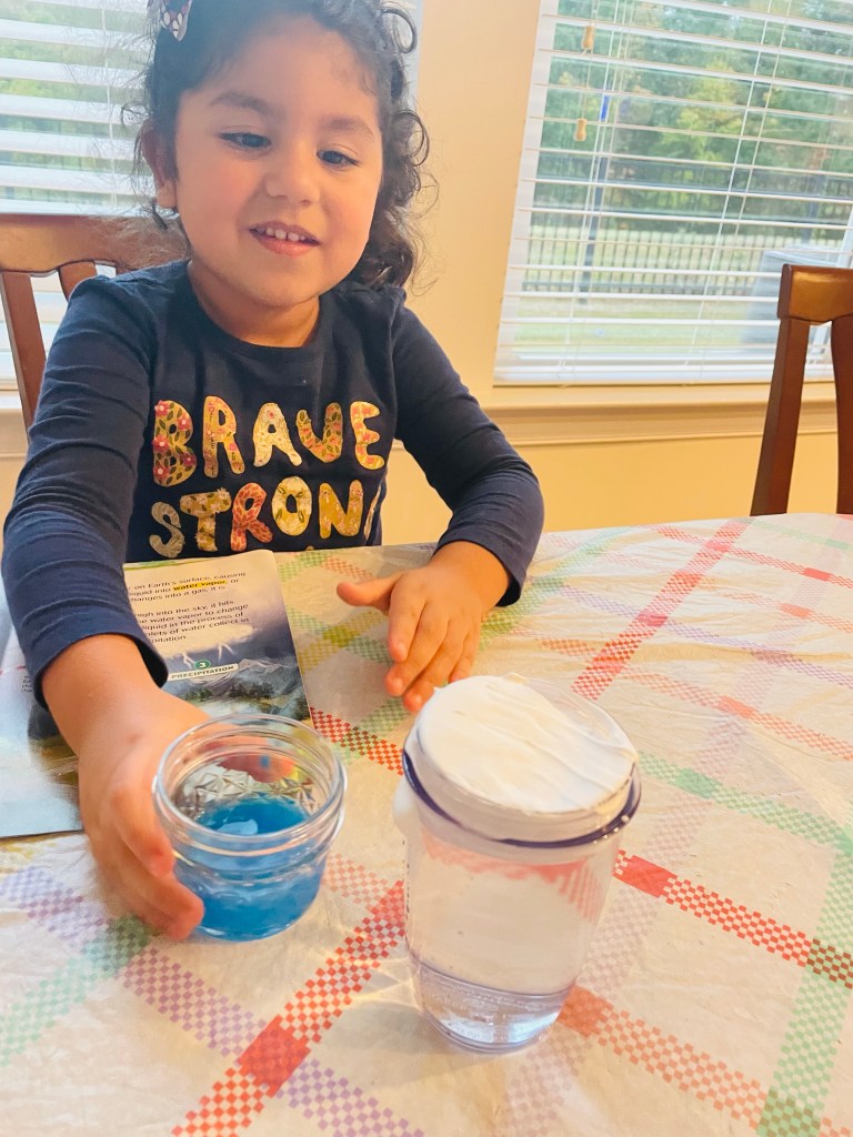We filled the medium glass with water. We added 1-3 inches of shaving cream to the top. The more shaving cream used the longer the experiment will last.